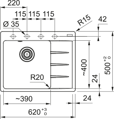 Dřez umožňuje vytvoření otvoru pro baterii či další příslušenství na 4 předpřipravených pozicích. Průměr otvoru je 35 mm a je vhodný pro veškeré příslušenství. Můžete si tedy vytvořit nejen otvor pro baterii, ale také pro ovládání výpusti, dávkovač saponátu nebo pro ovládání drtiče odpadu